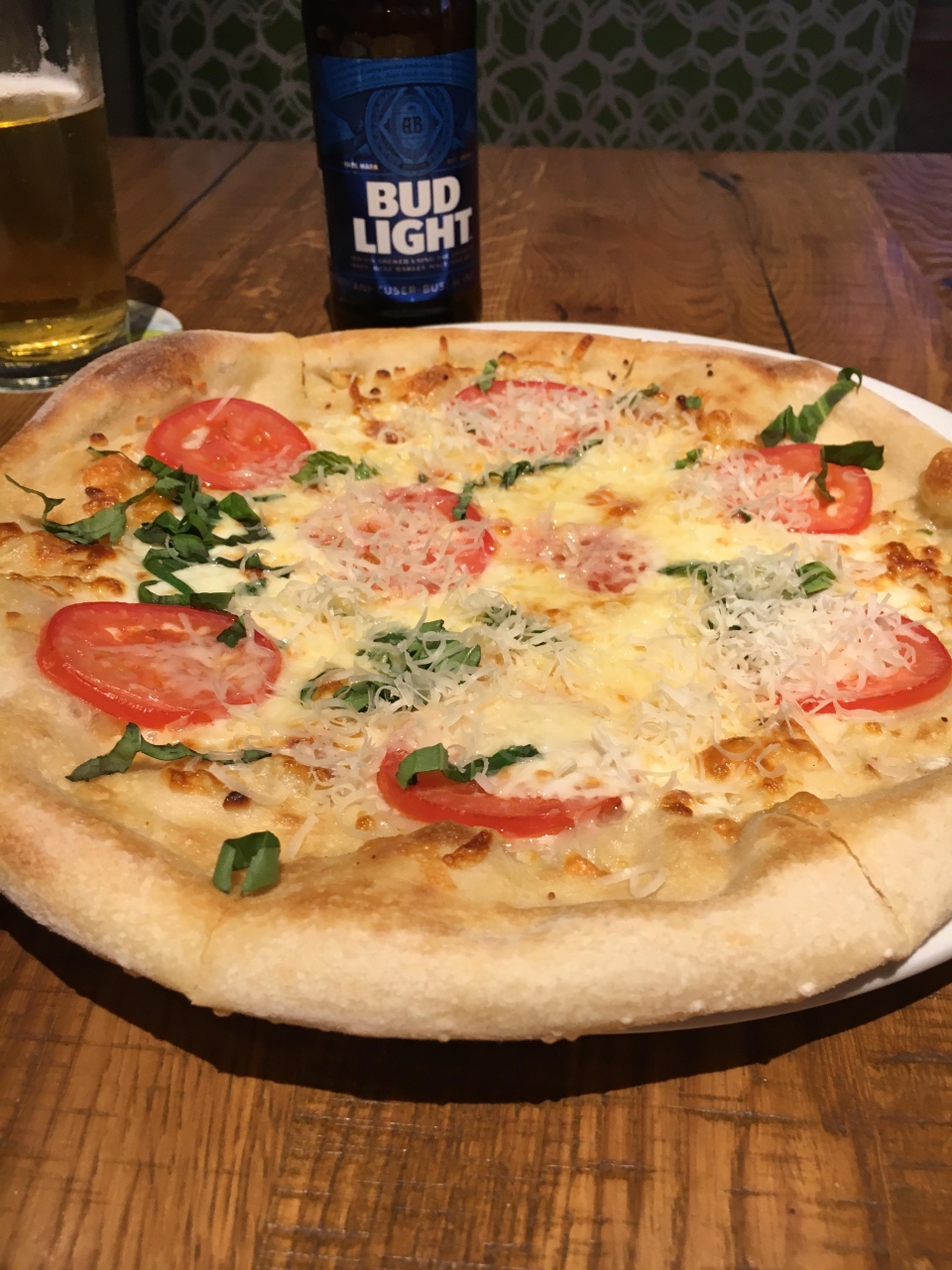 ロサンゼルスで、2回カルフォルニアピザキッチンに行きました。バドワイザーのビール小とピザで、25ドルくらいでした。10パーセントのチップ込みで。写真のピザが美味しい。セブンチーズとかいうピザだったような気がします。