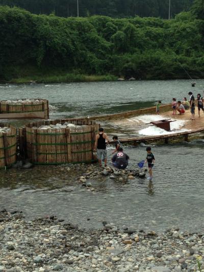 子供たちは、川の中で水遊びや、簗に上がってくる鮎を歓声を上げてつかんでいました。