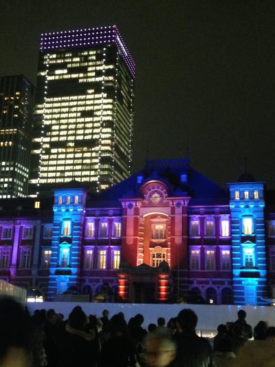 丸の内北口から、新丸の内ビルの北側を西へ、ビルに沿って左折し、東京駅を正面にみる道路へ。そこから駅を正面に見ながらライトアップを見学。これが、主催者の案内コースです。わたしは、新丸の内ビルを左折し、丸の内ビルまで、駅を左に見ながら行き、新丸の内ビルに再度戻って、東京駅中央口へ向って道路横断。鉄板フェンスが有って、無粋かと思いきや、囲い部分が過ぎたところでライトアップ東京駅が眼前に!