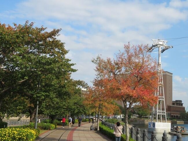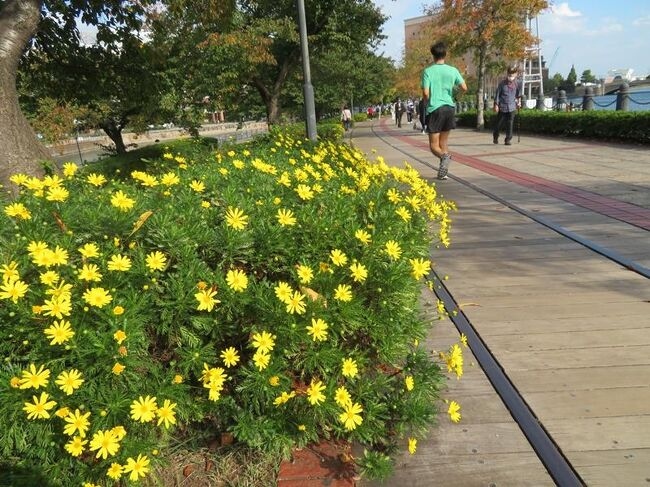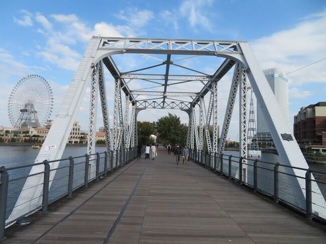 歩道の両側は運河に囲まれ見晴らしも良く、みなとみらいの観覧車やランドマークタワーも良く見えます。また花や木も整備されベンチもあるので途中で休憩しながら歩くのもいいかもしれません。