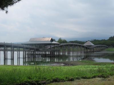 青森県鶴田町に位置する津軽富士見湖と呼ばれる廻堰大溜池(まわりぜきおおためいけ)にかかる日本一長い木造の三連太鼓橋で全長は300m以上あるそうです。