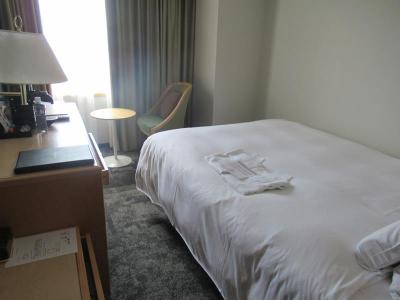 部屋は普通のビジホとは違ってワンランク上を感じさせる調度品。バゲージラック付きのチェスト、空気清浄機などもあります。さらにはマッサージクッション付きの椅子までありました。ベッドはシモンズのダブルベッド。