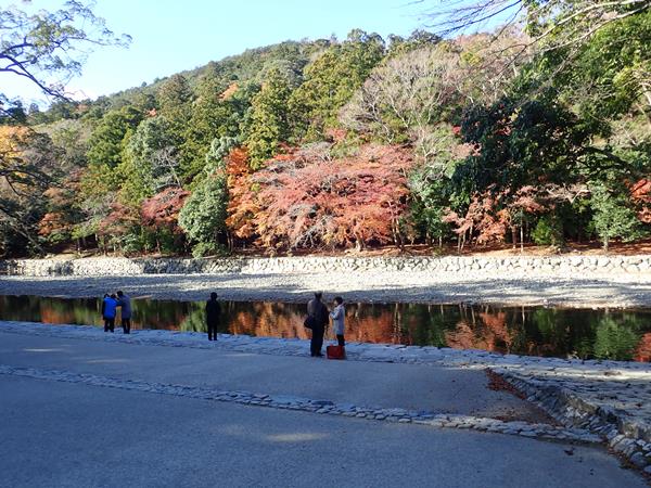 途中の五十鈴川の御手洗場(みたらしば)に立ち寄って手を清めました。ちょうど紅葉のシーズンで川面に映る紅葉がとてもきれいで、心も現れました。