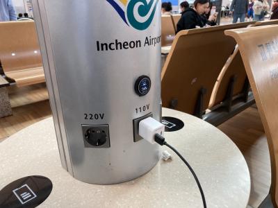 乗り継ぎで久しぶりにインチョン空港を旅行しました。コロナ後で旅客が戻っている印象です。チェックインまで時間があったので休憩中に充電が日本のコンセントそのままいける差し込み口があることを発見。USB差し込みもあり便利。