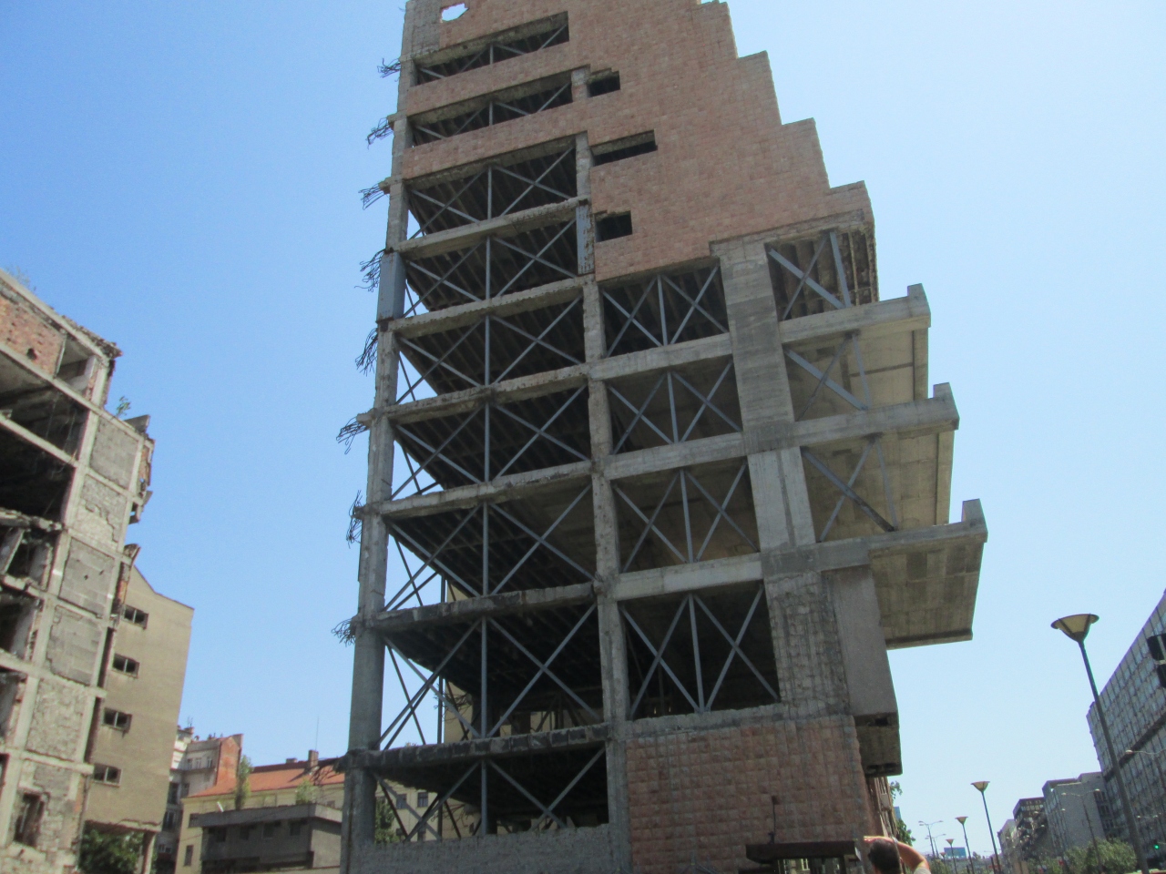 NATOが空爆したビルがある通りです。駅やバスターミナルから徒歩10分くらいで行くことができます。少し坂道になっている通りを登っていくと目に入ってくるのでわかります。駅から向かっていく途中に観光案内所がありマップをもらえました。