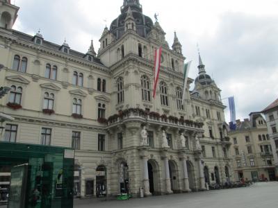 グラーツの市庁舎です。トラムでエッゲンブルク城から旧市街へ向かい広場で降りたところにありました。周辺は軽食屋台がいくつか出ています。広場に人が多くのんびりした雰囲気です。建物は美しく大きいので観光中の目印になります。
