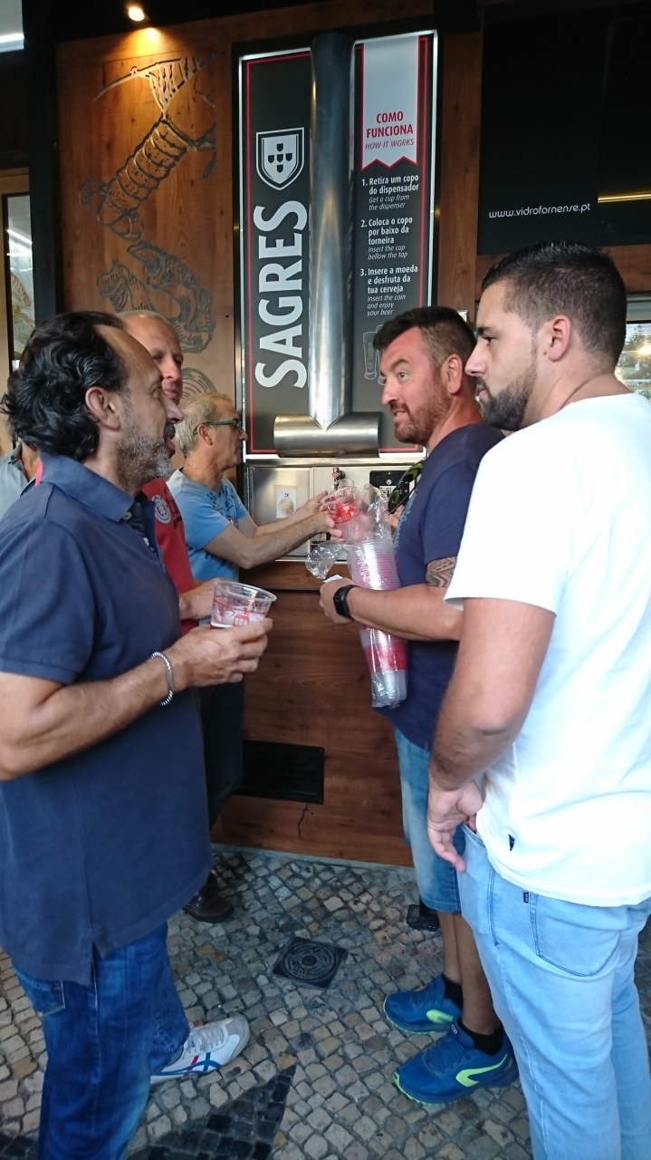 お店を外には、2€のカップでのビール自販機が設置。みんな飲みながらの待ちでした。