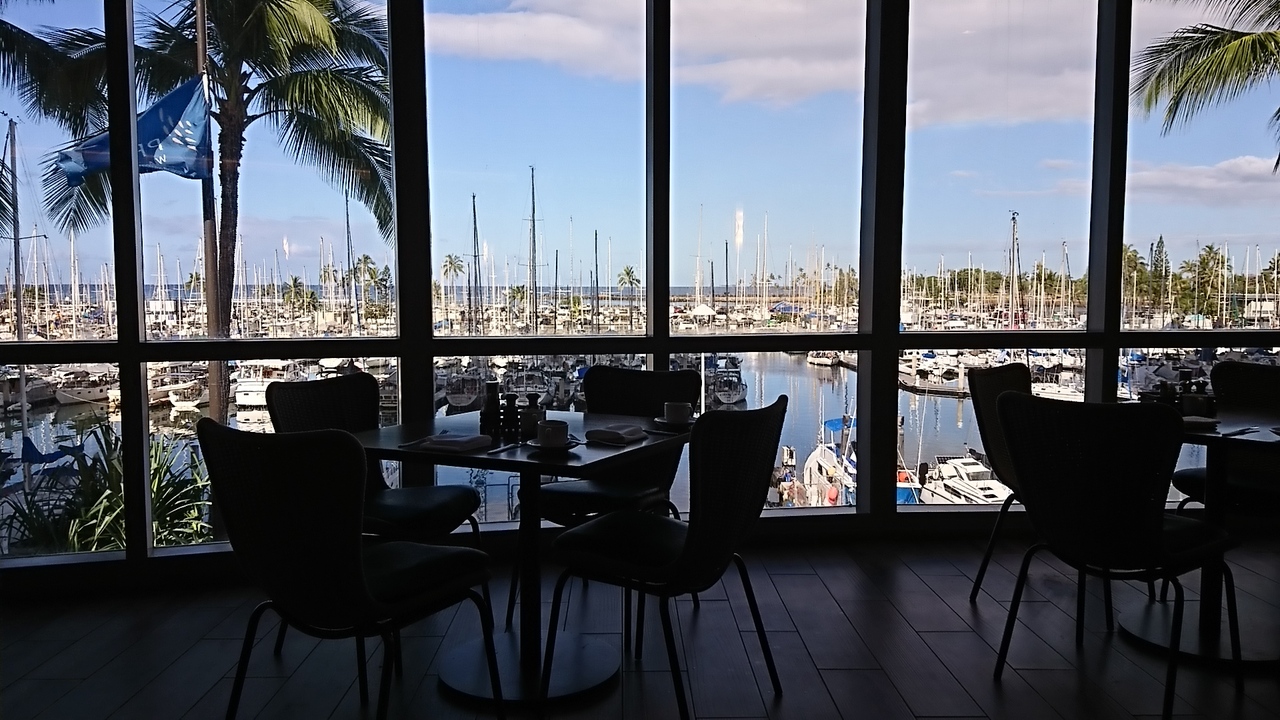 2階は吹き抜けのレストランです。窓からワイキキの街並みが一望できます。