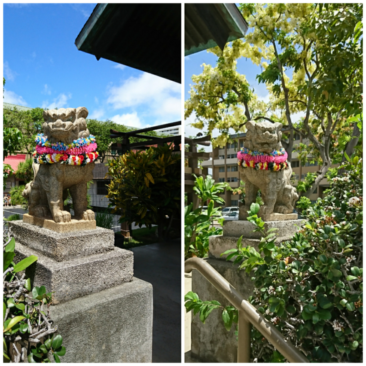 狛犬達にレイがかけられていて、トロピカル感が出ていました。(青空に映えていて、ステキでした)