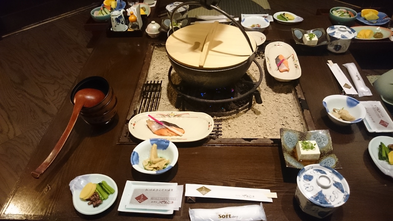 朝食は1階の和食レストランでいただきました。囲炉裏など、調度品に趣があり、食事も美味しくて楽しみました。床に長時間は座っていられませんが、朝食程度の時間であれば、ちょうどよいかな?