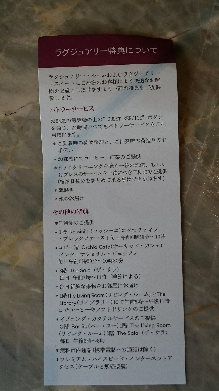ラグジュアリールーム特典に1日2点のpressもしくはlaundryが利用できるのですが、何故か1日分請求されていました。チェックアウトの時に確認したら、取り消ししてくれました。海外あるあるの一つですね? やっぱり請求はきちんと確認必要です。- 旅行時期