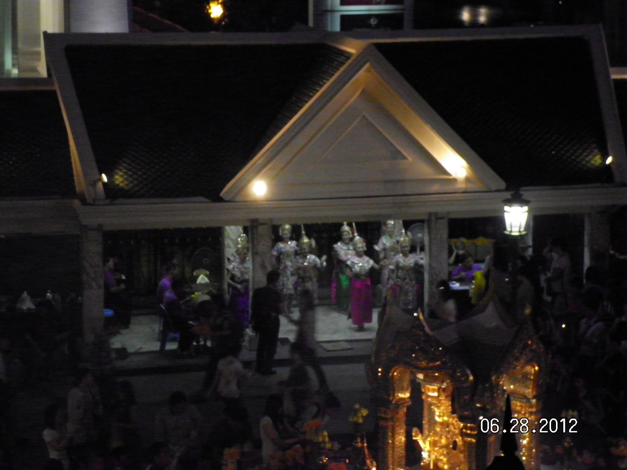 夜に歩道橋(?)を歩いていると、すごくお線香の香りがしてふとのぞくと、エワラン・プームでした。鮮やかなお花と辺りのライトアップ等もあって、とてもステキな雰囲気でした。その時は別の場所に行く予定だったので、通り過ぎただけでしたが、次の日お昼間に行ってきました。夜の雰囲気とは全く違い、暑い日差しときれいな青空と鮮やかなお花(お供え)が綺麗でした。40BT?くらいで、お花とお線香・ローソクのセットを購入し、いざお参り! 人が多いせいか、その数分後には私のお花は、ガザッと回収されていきました・・・。