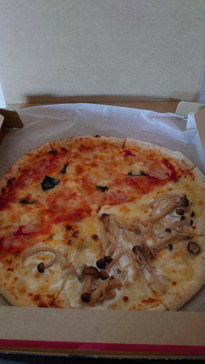 マルゲリータとキノコチーズのハーフを持ち帰りしました。イートインもできましたが、この時期なので、持ち帰りしました。