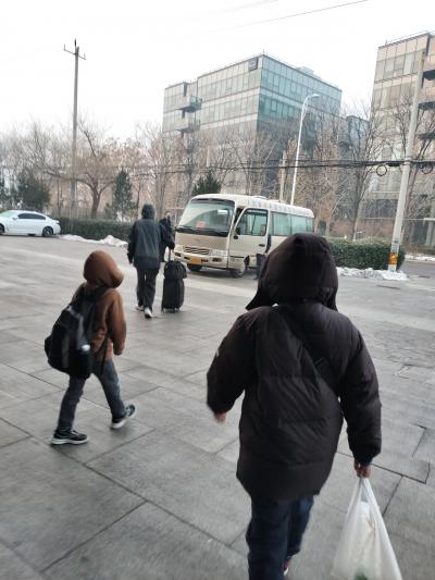 翌朝空港への送迎シャトルバスで一旦北京空港へ。雪がある~次男はダウン忘...
