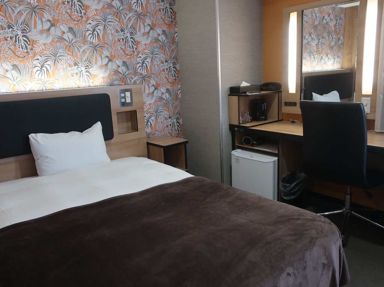 客室は狭いがリゾートを意識した壁紙が使われるなど