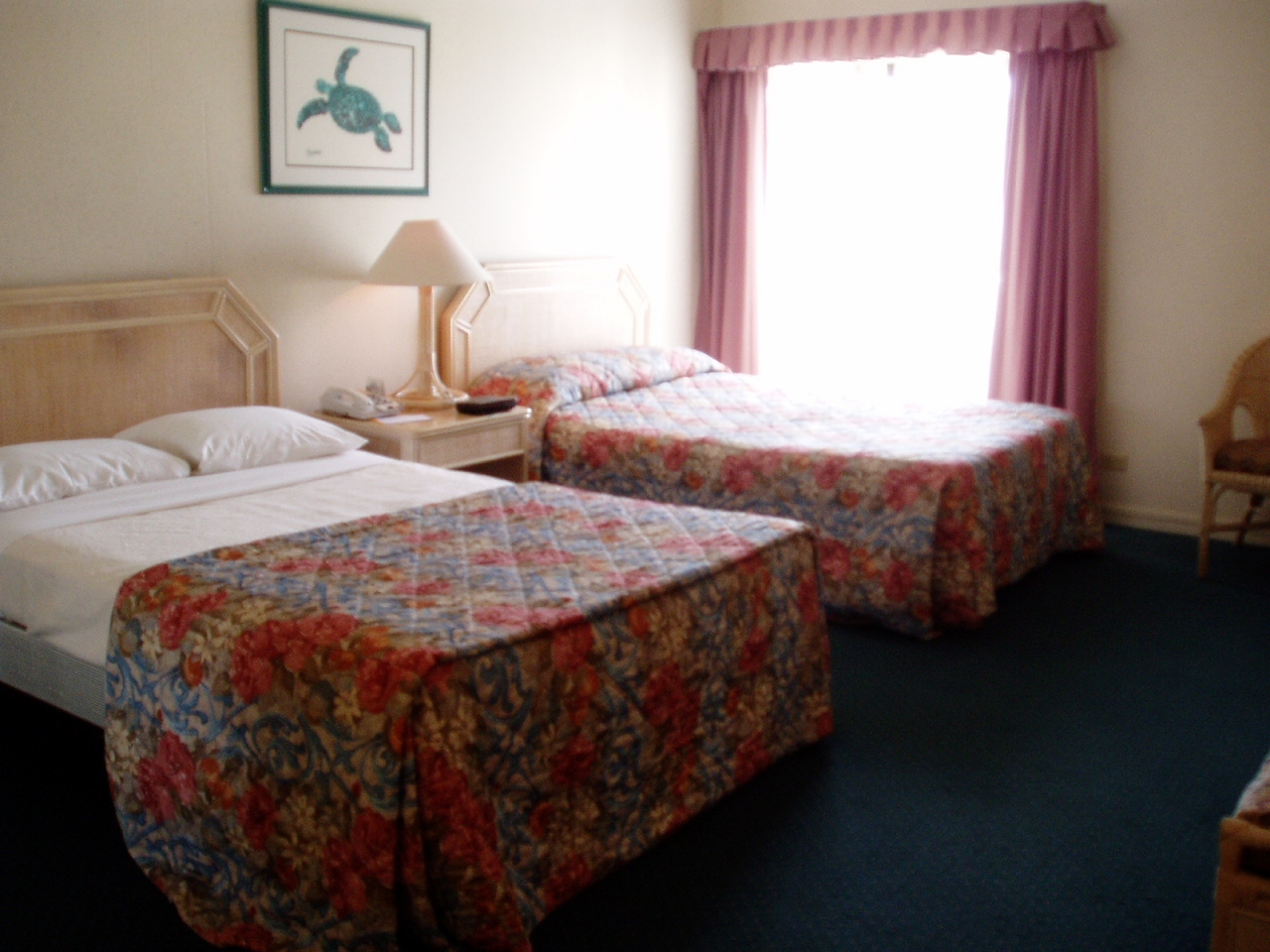 プレージャーアイランドなどにも徒歩約10分という立地が魅力なホテル。ただ、丘の上に建っているので、ホテルへの帰り道はちょっと辛いかも。元のサンルートホテル。今回は航空券と3泊のセットでなんと1万9800円という激安料金で泊まったので文句も言えませんが、(ラックレートは1泊129US$)隣の部屋の話し声は聞こえるし、水道などの流れる音が響くなどはっきり言って古いです。でも、きれいに保たれています。室内には、セーフティーボックスやコーヒーメーカー、冷蔵庫なども完備され、寝るだけならそれほど問題はありません。バスルームは狭いけど、洗面台がバスルームの外(室内にある)ので閉塞感はありませんでした。バスアメニティは、リンスインシャンプー、ソープ、ボディーローション、ヘアキャップは客室に完備され、それ以外に必要なものがあったらフロントで無料でもらえるというカードが置かれていました。小さなバルコニーからは海が見渡せます。海が望めるプールもありました。安くて便利な立地のホテルを選ぶならいいかもしれません。