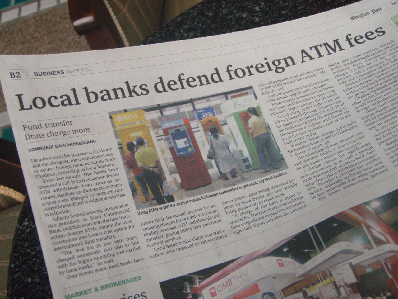 タイのATMが2009年4月から海外発行のカードを利用する際に手数料を導入しました。これまでcitiや新生などのキャッシュカードでお金を下ろしていた方はご注意ください。1回につき150Bです。僕もいつものように空港で下ろすと手数料表示があったので?と思っていたら、翌日の新聞にこの記事が載ってました。