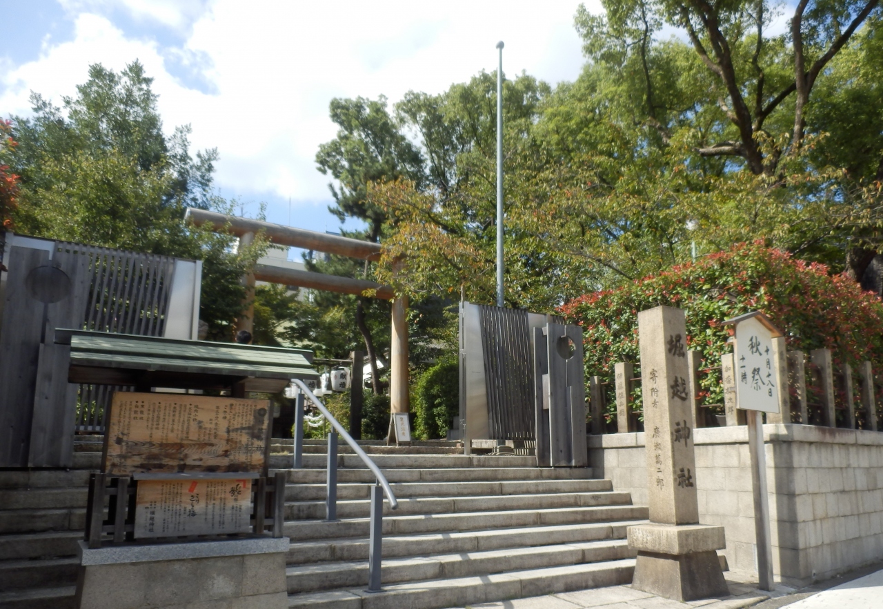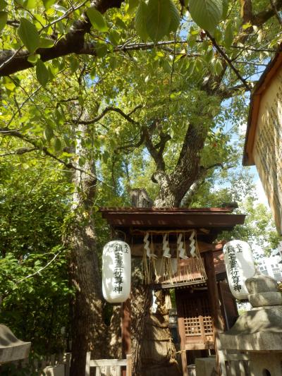 堀越神社境内に茂る楠木は大阪市の保存樹林の指定(平成5/11)を受けた御神木です、境内に建てられている大阪市の説明板によると樹齢550年、高さ13mの大木、神社は聖徳太子が建立の四天王寺とほぼ同時期と云われている古社です、当時の創建場所ち違っていますので楠木はかなり後に植えられたことになります、正面鳥居を入った右側に境内を覆っています