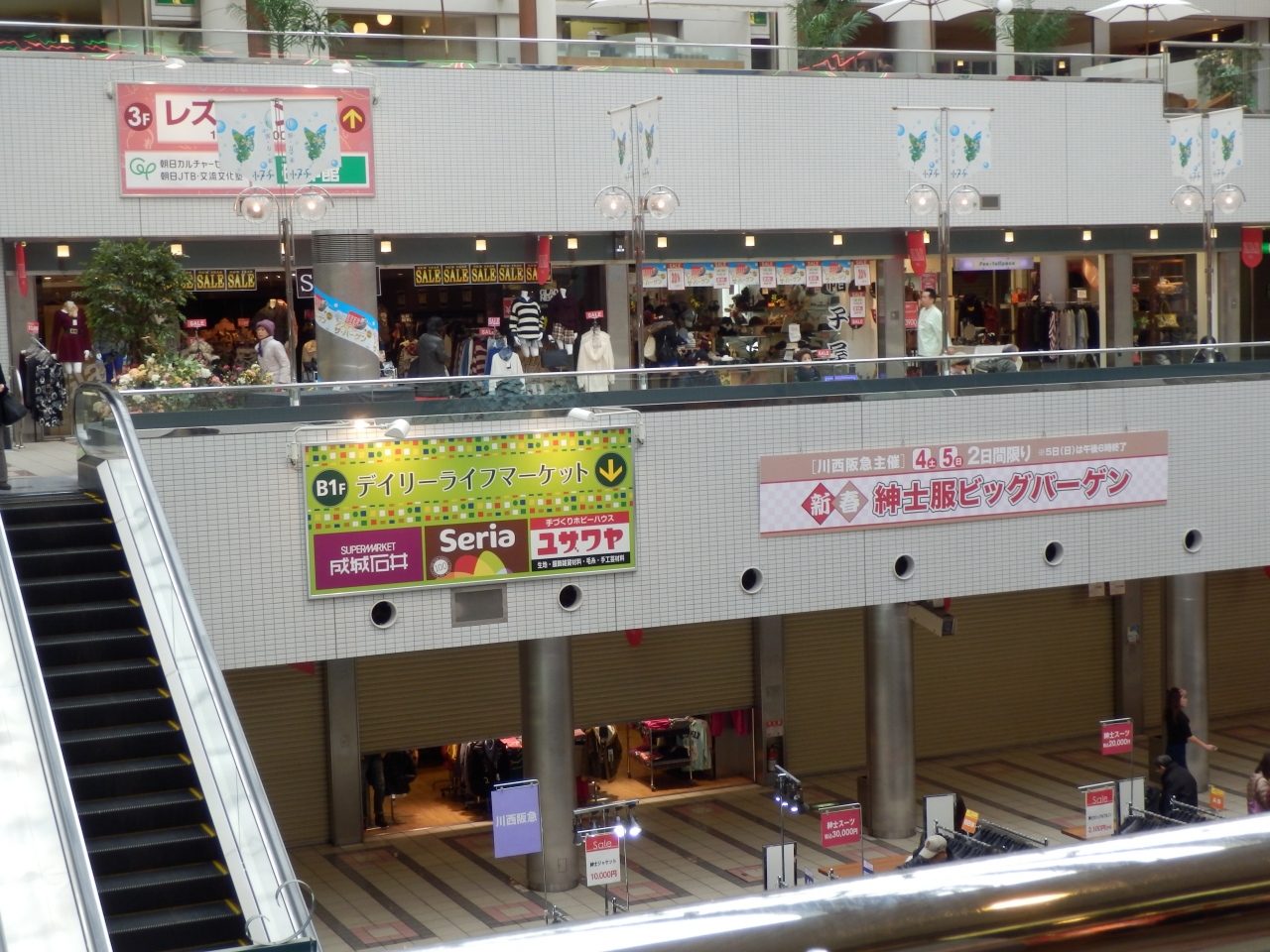 阪急宝塚線の川西能勢口駅改札を出るとその前が二階入り口、駅の高架下にある一階がマクドなどの食品、二階が衣料品店が占めている、改札前がウエスト、少し梅田よりへ進んでイーストがあるが店はわずかだ、駅が高架になった時出来たので二十年程度経過している