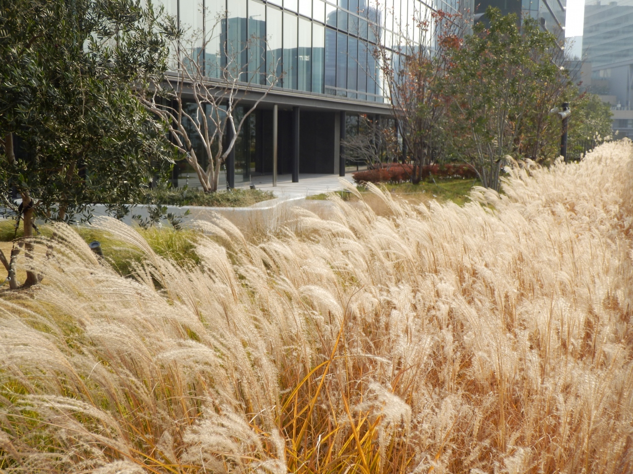 グランフロント大阪北館の9階にあるテラスガーデン、JR大阪駅の隣接ビルなのにテラスはあいかわらず閑散としている植えられている木々も根を張ってきたのかのびのびとした枝を張ってきている前回着たとき緑色のススキも黄色くなり冬の姿に変っていた、大阪のど真ん中でススキは手じかに季節を感じさせてくれるありがたい存在
