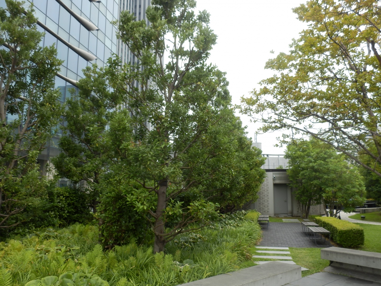 です、建物は二階以外繋がっていません、判りにくい場所でJRからグランフロントに入ると直ぐ右のエレベーターで八階(八階止め)(へここからエスカレーターで九階へ。裏口みたいなドアーからテラスに出ます、屋上なので樹木はあまりありませんがよく茂ってきていました、ここへ来る人はいつ来てもほとんどいませんので貸し切りの庭園の感じでのんびりできます- 旅行時期