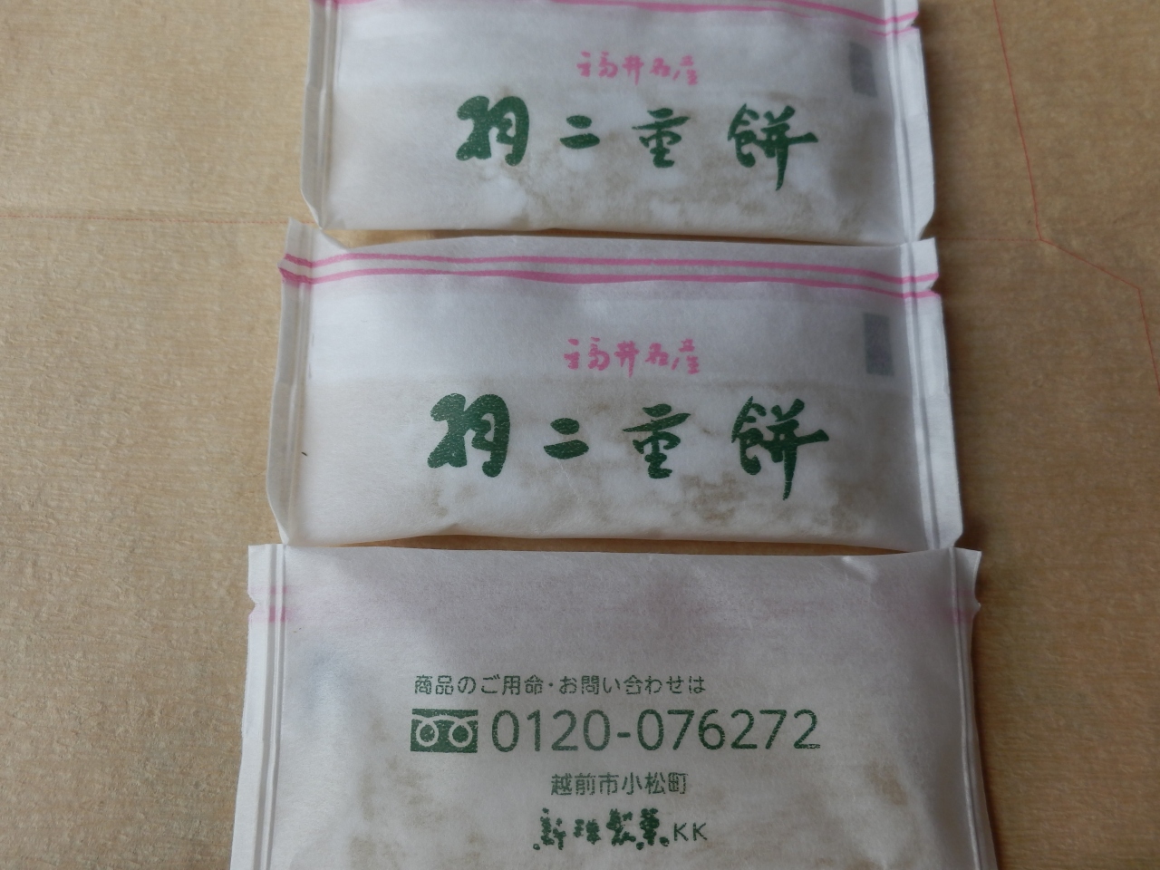 越前福井の名産羽二重餅(はぶたえもち)です、越前地方の絹織物の感触を和菓子のお餅で再現したとされています、舌に乗せるとトロットと溶けそうです、一袋長さ10CM程度のお餅を引っ張ると40CMに伸びそうです(実際引っ張っておりません)絹のイメージ通りです