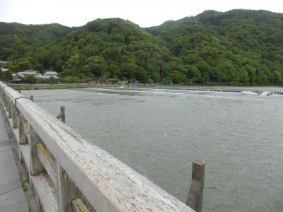 京都の有名な観光地である嵐山に流れている桂川(橋の欄干には大堰川と記されています)に架かる橋、嵐山のパンフには必ず掲載されていて嵐山のシンボルとなっている。橋から上流やや左上方の一番高い山が嵐山です、桂川の清流、嵐山津の緑、そして渡月橋で嵐山全体が美しく表現できています中央は車道で大型の定期バスが運行しており両側の歩道はいつ来ても観光客であふれている今年はめっきり外国の人の方が多く感じられた、パンフを片手に迷うことなく先へ進んで行くのは事前によく下調べをしてきているのだと感心させられます外国での知名度も高いのでしょう、嵐電=らんでん(京福電鉄の愛称)嵐山駅から徒歩3分阪急嵐山駅から徒歩8分の場所に架かっている