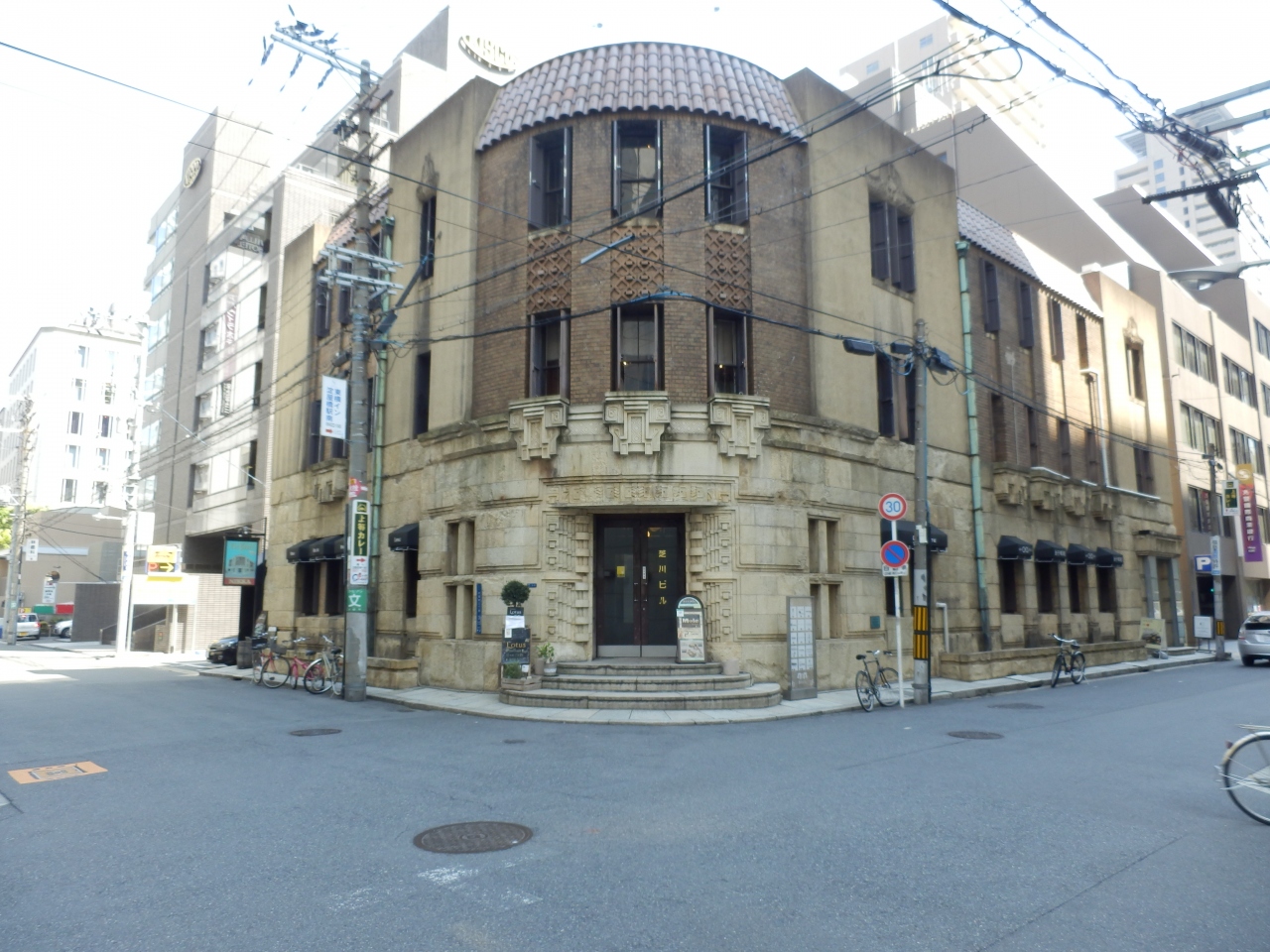 大阪市中央区平野町二丁目、堺筋と御堂筋の間だが堺筋が近い、地下鉄堺筋線北浜下車徒歩五分付近にある。このビルも登録有形文化財指定になっている。正面入り上部に八角形ノステンドグラスが嵌め込まれていた。ビルに沿って張られている電話線が無粋。電話は繋がればよいという工事はやめてほしい景観を大切に、