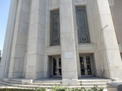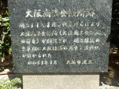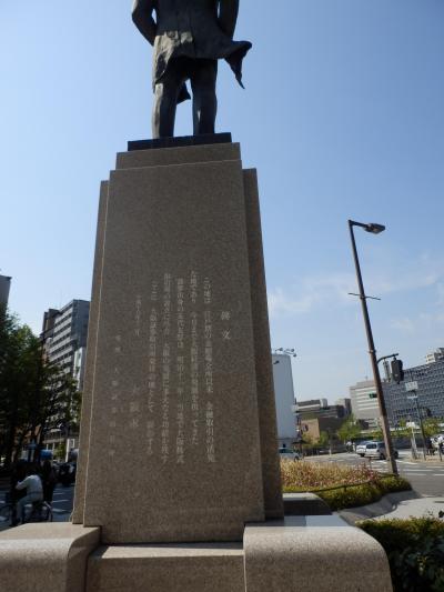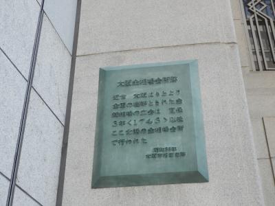 大阪証券取引所の正面入り口前に建てられいる像、像に彫り込まれている文言に、江戸の金相場会所以来金融取引の活発な地域で、薩摩藩士五代友厚が大阪株式取引所設立に寄与した、と記されていた,像の設立者は、大阪証券取引所、京阪電車および地下鉄堺筋線北浜駅下車すぐ、