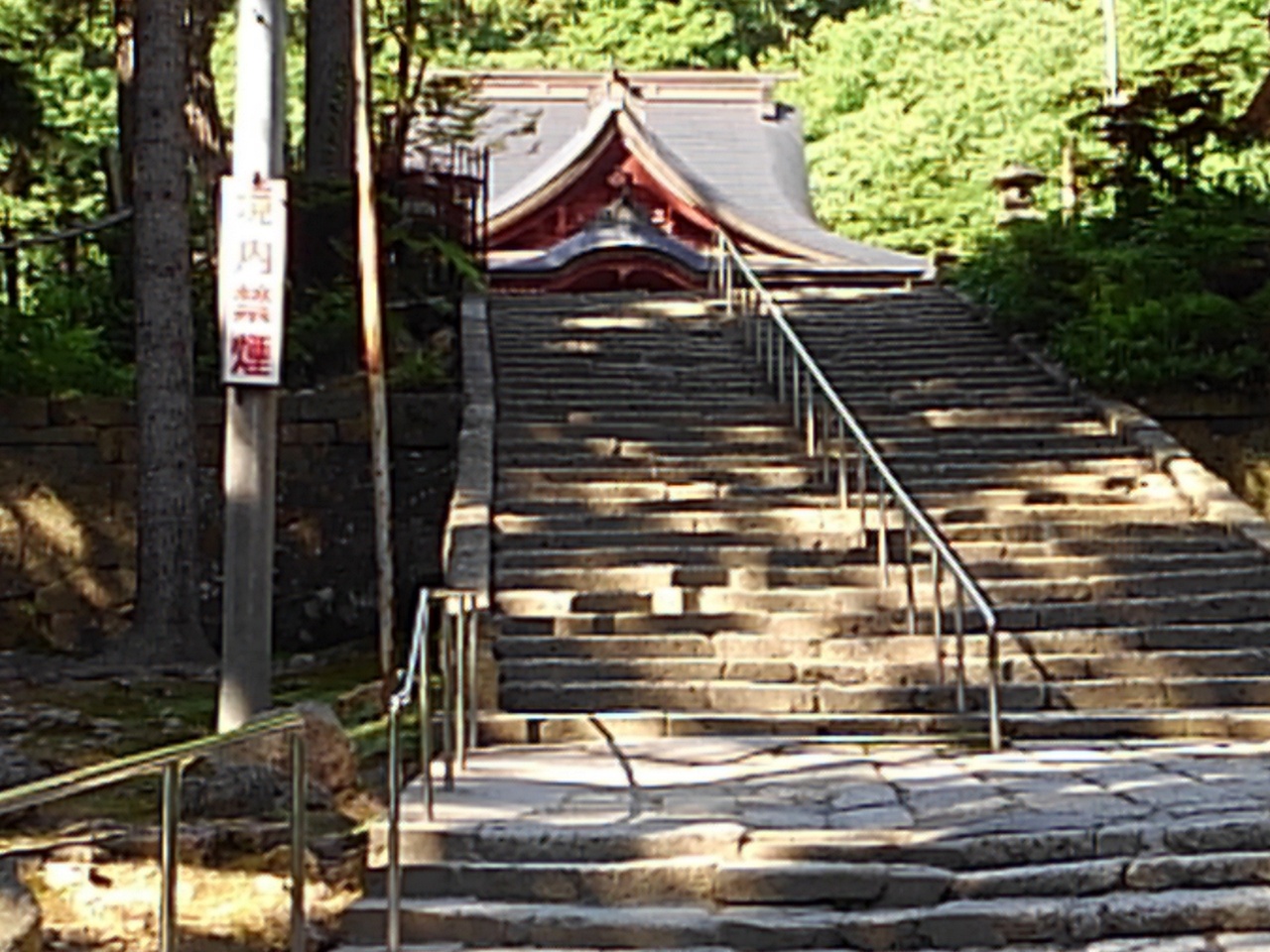 石畳の坂を100mほど登ると本殿に続く石段があります。合格祈願をした冬季は、この石段に雪が積もりアイスバーン状態になっていて、ロープを掴んで慎重に昇り降りしました。滑ってしまっては、縁起でもないからです。