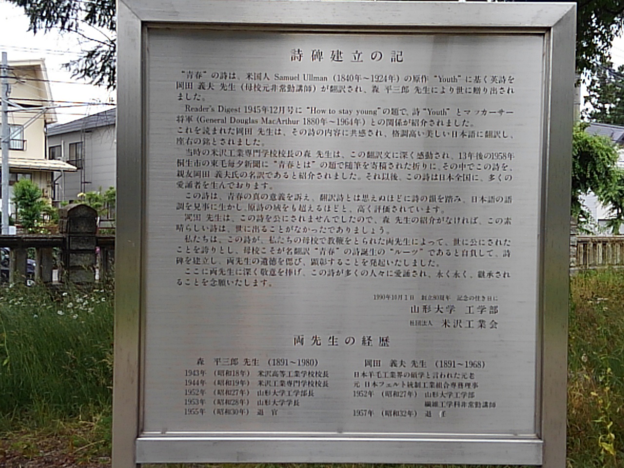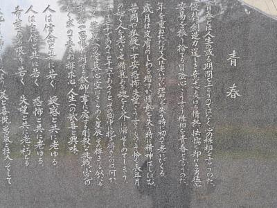 敷地内に大きな石碑があったので、碑文と案内板を読んだら、有名な青春の詩がこの学校の非常勤講師によって英文から和訳され、当時の校長が世に広めた経緯が記されていました。