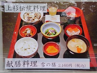 建物内は御食事処になっていて、米沢牛も味わうことが出来るようですが、門の脇に貼ってあった料理の写真は、慎ましい田舎料理で、値段も2,160円と庶民価格でした。