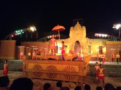 土曜日の夕方に週末限定のショーを見るため妻と2人で行きました。1時間ほどのショーのために1人15ドルの入場料を払うのは、もったいないような気もしましたが、「ザ・グレーテスト・キング・ジャヤバルマン7世」と題したショーは、アプサラダンスなどの優雅な動きと、マッチョな男性ダンサーの3回連続バック転などスピード感のある動きを巧みに組み合わせてストーリー展開するもので、迫力がありました。最後には本物の象も加えたオールキャストのパレードがあり、妻とともに歓声をあげました。