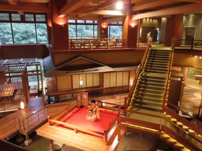 舞台のある吹き抜けのロビーや露天風呂につながる長い階段は、まるで人気アニメ「鬼滅の刃」の無限城のようです。