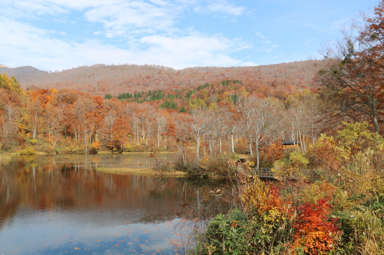 着いてみると、旅館は皆、建て替えられて小綺麗になり、ちょっとしたリゾートの雰囲気が漂っていました。近くの二つの沼(五色沼、地蔵沼)は水鏡となって、紅葉が上下対称に増幅され、うっとりするほどの美しさでした。