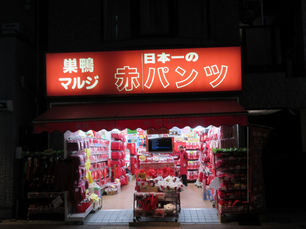 巣鴨駅近くまで歩いたところには、「日本一の赤パンツの店」があって、店内は真っ赤な男性用下着で一杯。