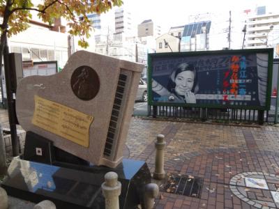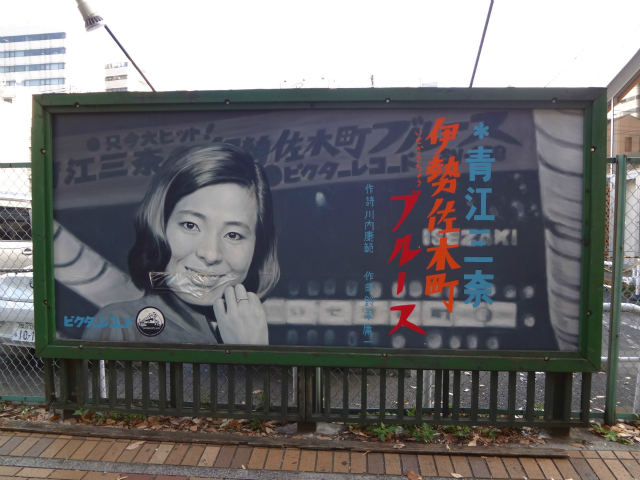 歌碑自体はあまり目立たなくて、素通りしてしまいそうになりますが、その後ろに貼ってある昔の青江三奈のポスターはすぐに目につきます。
