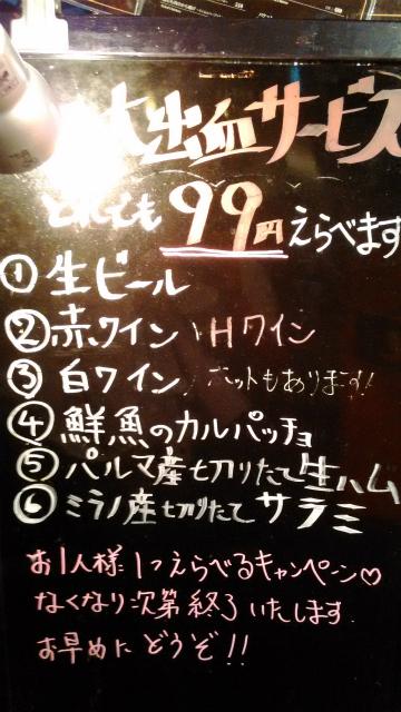 私たちが行ったときはお一人様一品のみ99円サービスをやっていて、生ハムやカルパッチョなんかを安く食べることができました。