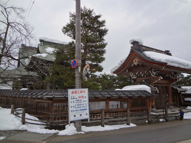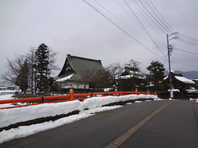 飛騨古川駅前右手にある観光案内所側から瀬戸川方面にまっすぐの道を行くと右手にすぐあるお寺です。