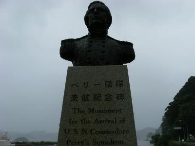 「ペリー艦隊来航記念碑」のペリー像とともに