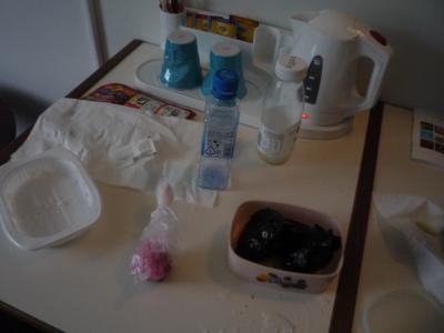 持参したチーンするご飯をレストランで温めてもらい、海苔、梅干しでおにぎ...