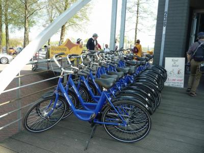 風車のキンデルダイクにバスで到着しますと、目の前に、お土産屋さん兼レンタサイクルの建物があります。