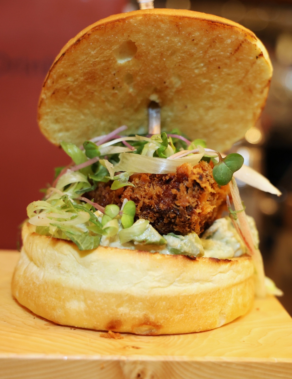 メバチまぐろの漬けのフライに特製のわさびとアボカドタルタル・大葉・茗荷・白ネギをサンドしてます。箸休めのガリが付。