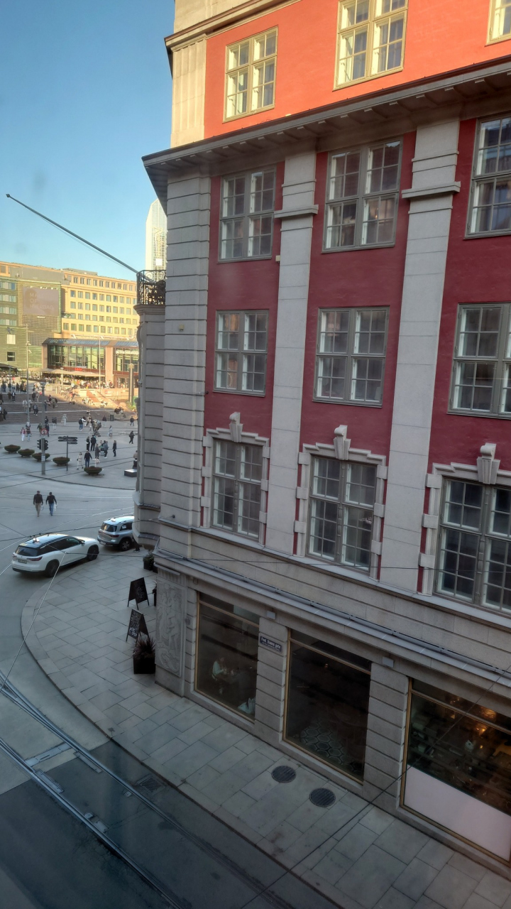 中央駅出て徒歩2~3分で一部石畳とトラムの線路を通らなければなりません。