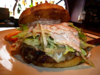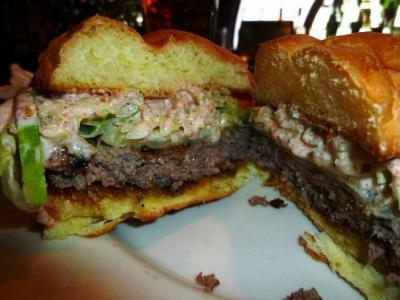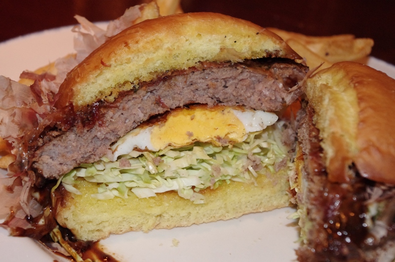 240gのUSビーフパテにピリ辛のお好み焼きソース。たぶんドロソースかな?