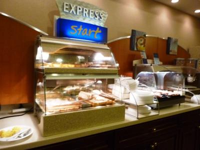 6~10時まで無料の朝食(ベーグル・デニッシュ・ブラウンブレッド・スクランブルエッグ・シリアル・バナナ等)