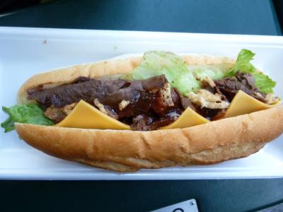 2号門前に販売車が停まってる事もあります。BBQソースのビーフにチーズ・フライドオニオン・レタスをサンドして見たまんまの味で悪くは無かったです。けどお高い?