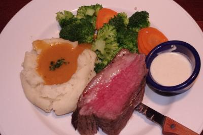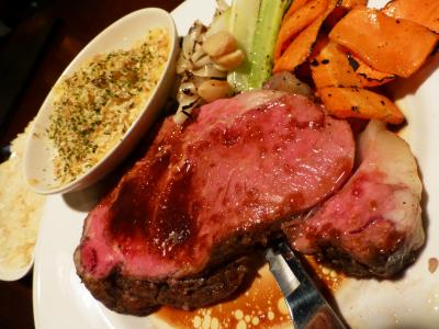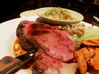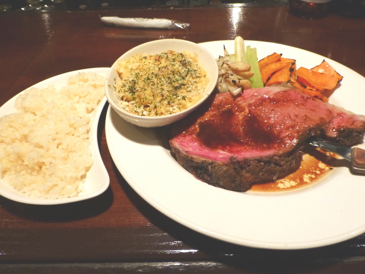 今年のはリブアイ250gを使ったローストビーフで付け合わせが温野菜じゃなくグリルした野菜(玉ねぎ・セロリ・人参・ニンニク)べイクドマカロニ(グラタン?) バターライス付き。
