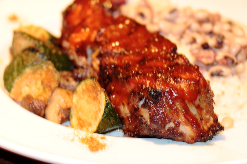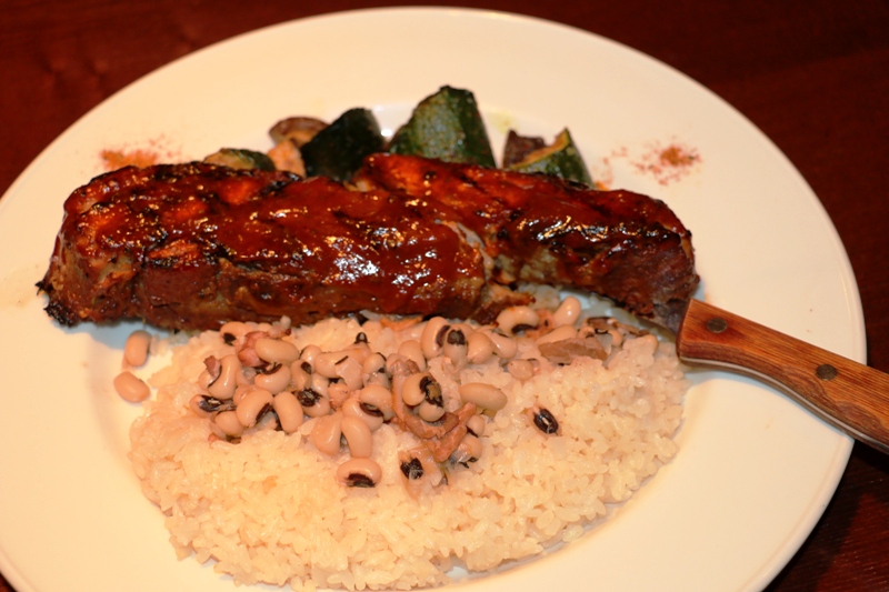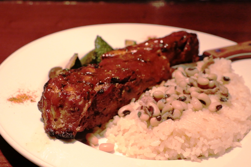 アメリカ南部のアメリカ風習の正月に”ホッピン・ジョン”というブラックアイドピー(黒目豆)とお米を混ぜ合わせた料理を食べると福を呼び込めるという言い伝えの料理を再現! それにBBQ味の豚バラ肉のローストと付け合わせにズッキーニと椎茸のフライ。
