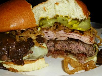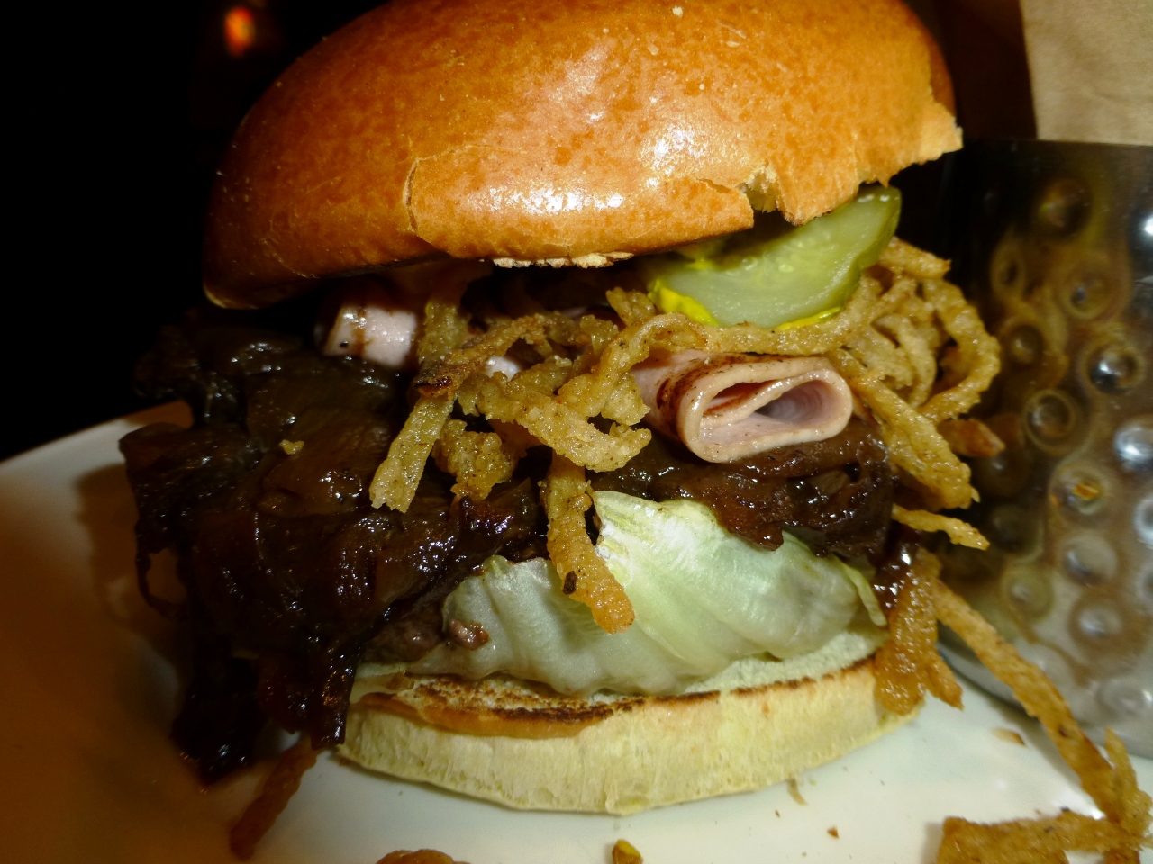 ビーフパテの上のハムとオニオンフライが大きな特徴でした。多めのスライスピクルス・トマト・レタス、ソースになるのか?バターで煮込んだようなこげ茶色のスライスマッシュルームの味が個人的に口に合わなかったのは事実…